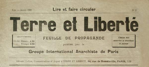 En juin 1908, à Paris, sortie du numéro deux du journal "Terre et Liberté" Feuille de propagande publiée par le Groupe International Anarchiste de Paris. G. Roussel en est le rédacteur administrateur et Eugène Deniau-Morat le gérant. A noter que le premier numéro de ce journal ne porte pas de date, mais a sans doute été publié le mois précédent, le journal annonce qu'il paraîtra tous les 15 jours, mais seulement deux numéros sont connus. A noter dans ce numéro 2 la signature de Ch. Gratz secrétaire du Groupe d'Etudes Sociales de Dôle. Ne pas confondre avec le journal "Terre et Liberté" publié également à Paris, mais en 1884. "Terre et Liberté, pour être anarchiste, n'en sera pas moins antimilitariste et révolutionnaire ; c'est à dire qu'il ne bercera pas ses lecteurs dans des discussions oiseuses ; qu'il n'emasculera pas les énergies dans la poursuite de la solution de problèmes plus ou moins scientifiques. Il aura surtout pour but, se rendant compte de la lente évolution des cerveaux humains, de développer l'esprit de révolte d'un façon consciente".