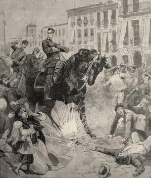 général Arsenio Martínez Campos, s'apprête à passer les troupes en revue pour le défilé, l'anarchiste Paulino PALLÁS, désirant venger les victimes de la répression en Andalousie ( février 1892) jette deux bombe sur le général aux cris de "Vive l'Anarchie !". L'explosion provoque la mort d'un garde civil, mais Martínez Campos n'est que blessé. Dans la confusion, huit personnes trouveront la mort piétinées par les chevaux des soldats et certaines touchés par des coups de feu tirés par les membres de la Garde Civile. Paulino Pallás n'opposera aucune résistance à son arrestation, il sera condamné à mort le 29 septembre 1893 et fusillé quelques jours plus tard, le 6 octobre. Devant le peloton d'exécution, il menacera d'une vengeance terrible "La venganza será terrible".